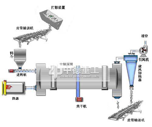 沙子由皮帶輸送機(jī)或斗式提升機(jī)送到料斗,然后經(jīng)料斗的加料機(jī)通過(guò)加料管道進(jìn)入加料端,加料管道的斜度要大于物料的自然傾角,以便物料順利流入干燥器內(nèi),烘干機(jī)的滾筒是一個(gè)與水平線略成傾斜的旋轉(zhuǎn)圓筒,河沙等物料從較高一端加入,載熱體由低端進(jìn)入,與物料成逆流接觸,也有載熱體和物料一起并流進(jìn)入筒體的。隨著圓筒的轉(zhuǎn)動(dòng)物料受重力作用運(yùn)行到較底的一端,濕物料在筒體內(nèi)向前移動(dòng)過(guò)程中,直接或間接得到了載熱體的給熱,使?jié)裎锪系靡院娓?,然后在出料端?jīng)皮帶輸送機(jī)送出。在轉(zhuǎn)筒內(nèi)壁上還裝有揚(yáng)料板,主要是在轉(zhuǎn)筒滾動(dòng)中將物料抄起再撒下,由此使?jié)窳喜灰渍辰Y(jié),充分與氣流接觸,得到效率高烘干。