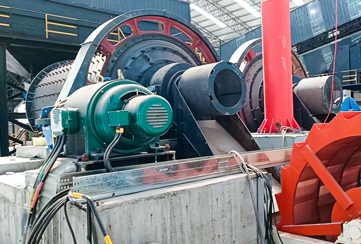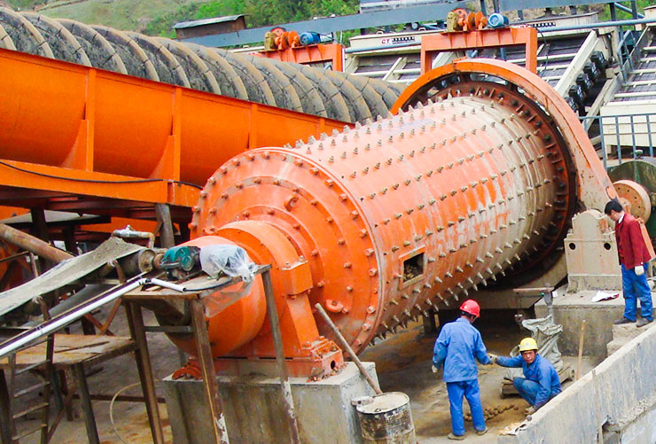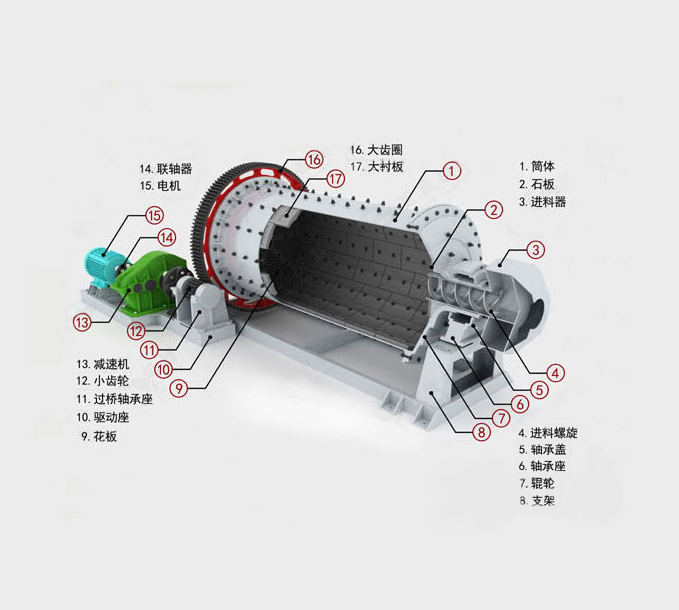 球磨機由給料部、出料部、回轉(zhuǎn)部、傳動部(減速機、小傳動齒輪、電機、電控)等主要部分組成。中空軸采用鑄鋼件,內(nèi)襯可拆換,回轉(zhuǎn)大齒輪采用鑄件滾齒加工,筒體內(nèi)鑲有耐磨襯板,具有良好的耐磨性,本機運轉(zhuǎn)平穩(wěn),性能可靠,根據(jù)物料及排礦方式,可選擇干式球磨機和濕式球磨機。
