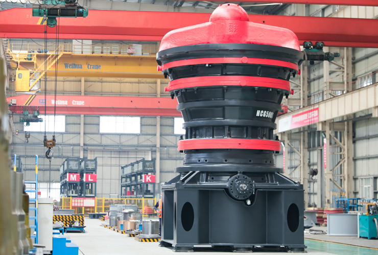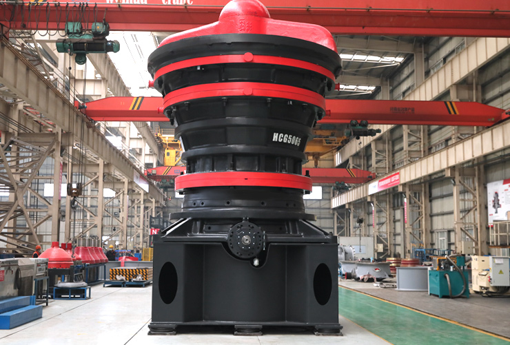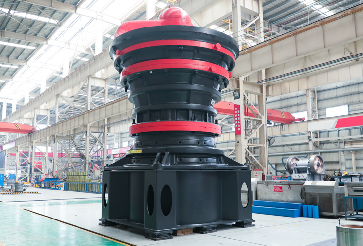 旋回式破碎機主要由橫梁部、上中下機架部、動錐部、偏心套部、傳動部和液壓缸部等組成。在設備工作時,由電動機帶動水平軸旋轉,水平軸通過齒輪帶動偏心套旋轉,再由偏心套帶動動錐部做圓周擺動,從而實現(xiàn)連續(xù)的擠壓破碎石塊??赏ㄟ^調節(jié)動錐底部的液壓缸改變排礦口的大小,方便調整產品粒度;同時液壓缸也提供過鐵保護功能,當有不能破碎的物體進入破碎腔時,液壓缸能自動使動錐下落釋放物體,保護破碎腔。